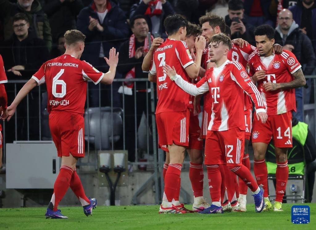 3月6日,拜仁慕尼黑队球员在比赛中庆祝进球。