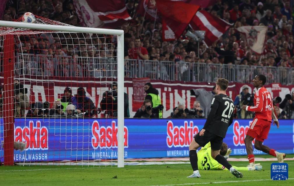 3月6日,拜仁慕尼黑队球员雅克松(右)在比赛中射门得分。