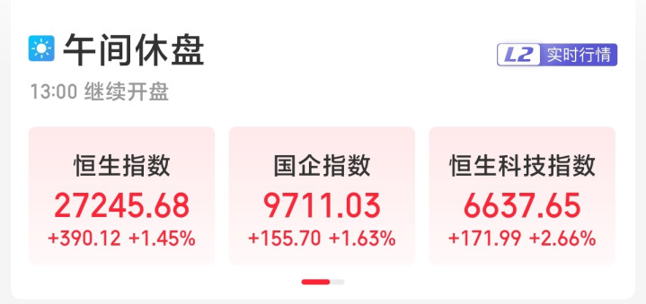 中新经纬10月2日电10月2日早盘,港股三大指数集体上涨。截至午间收盘,恒生指数涨1.45%,恒生科技指数涨2.66%金融配资开户论坛,恒生中国企业指数涨1.63%。大市半日成交额1240亿港元。